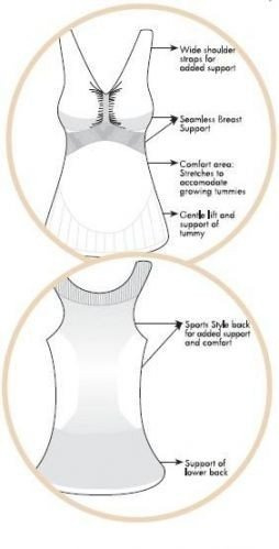 Posiada szerokie ramiączka, bezszwowe elementy podtrzymujące pod biustem oraz wszywkę wzmacniającą podtrzymanie brzuszka i odciążającą okolice kręgosłupa. Specjalnie zaprojektowana rozciągliwa część łatwo dopasowuje się do rosnącego brzuszka.
