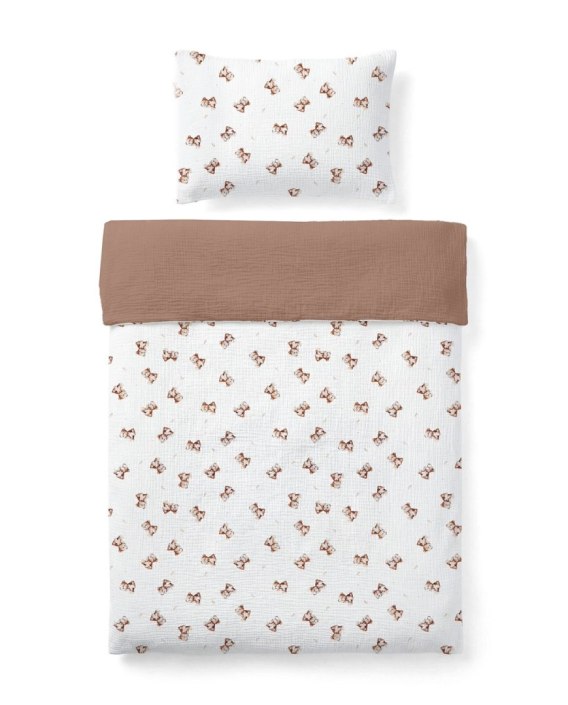 Dwustronna aranżacja: Komplet jest dwustronny - jedna strona to nadruk w misie, natomiast druga to gładki muślin w głębokim, karmelowym kolorze. Pozwala to na błyskawiczną zmianę estetyki łóżeczka.
