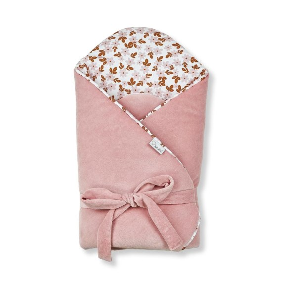 Satyna bawełniana, z której wykonany jest różek, to tkanina naturalna i przyjazna dla skóry dziecka. Posiada wyjątkowy nadruk kwiatków, który dodaje produktowi wyjątkowego charakteru. Druga strona wykonana jest z miękkiego i przyjemnego w dotyku weluru bawełnianego. Rożek ma wszyte antyalergiczne wypełnienie, które w doskonały sposób izoluje ciepło i przepuszcza powietrze. Nie posiada dodatkowego usztywnienia, dzięki czemu zapewnia utrzymanie naturalnej i wygodnej dla noworodka pozycji. Wiązany na kokardę, pozwala na indywidualne dopasowanie rozmiaru rożka do wymiarów i potrzeb niemowlaka.