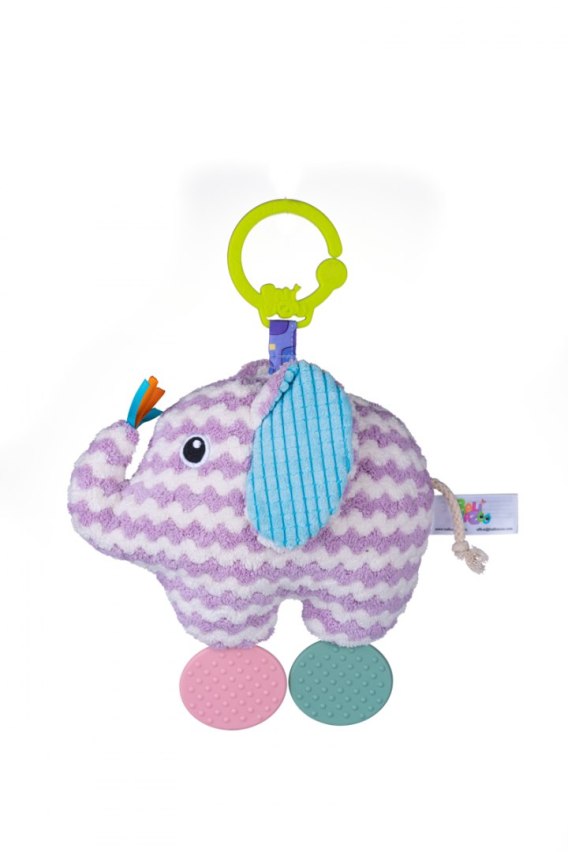 Hej maluszku, przytul Słonika i wyszepcz mu do szeleszczącego uszka wszystkie swoje sekrety! Ten śliczny zwierzak, w pastelowych kolorach, posiada ciałko uszyte z materiału o zróżnicowanej fakturze, które stymuluje zmysł dotyku dziecka i wspomaga rozwój jego umiejętności poznawczych. Dodatkowo, na bobaska czekają tu doczepione gryzaczki oraz dzwoneczek ukryty w słoniowym brzuszku. Wygodny uchwyt pozwoli przymocować zabawkę w dowolnym miejscu.