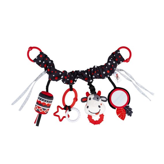 Kontrastowa zabawa w zasięgu ręki bobasa! Ta praktyczna zawieszka, wyposażona w elastyczną taśmę, dwa rodzaje mocowań (zapinane kółka oraz wiązane tasiemki) i cztery różne zabawki, sprawdzi się zarówno w domu, jak i na spacerze. Znajdziemy tu bezpieczne lusterko do samopoznania dziecka, materiałową głowę krówki z gryzaczkiem, dzwoneczek, a także twarde kształty, zawieszone na odczepianym kółeczku. Zabawka wykonana została z kontrastowych materiałów o zróżnicowanych fakturach, co stymulować będzie zmysły bobasa, rozwijając przy tym jego zdolności poznawcze.