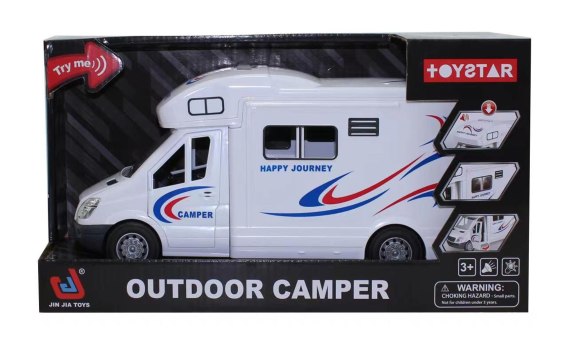 Interaktywny kamper z funkcją dźwięku i światła oraz otwieranymi drzwiami dla dzieci od 3-go roku życia. Zabawka wykonana została z najlepszej jakości plastiku i jest bezpieczna dla dzieci. Kamper posiada otwierane drzwi boczne, tylne i dach, łatwo przemieszcza się po podłożu dzięki gumowym kołom i napędzie power friction. Kamper posiada oświetlenie wnętrza pojazdu, a na dachu znajduje się panel muzyczny z realistycznymi dźwiękami klaksonu czy jazdy. Zabawka zasilana jest bateriami typu 2 x AA 1,5V (w zestawie).