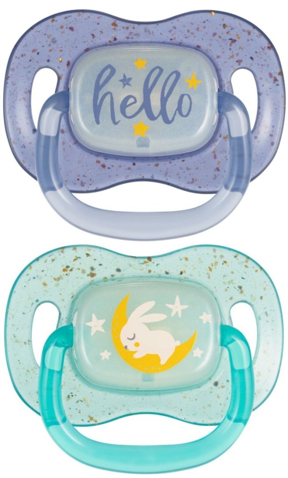 Silikonowy smoczek uspokajający z kolekcji NightGlow zrelaksuje i wyciszy Maluszka. Smoczki symetryczne dobrze dopasowują się do buzi dziecka niezależnie od sposobu umieszczenia, a ich kształt uważany jest za najbardziej fizjologiczny i wspierający utrzymanie naturalnego rytmu ssania oraz prawidłowego rozwoju mowy. Gumka została wykonana z najwyższej jakości delikatnego silikonu. Jest bezzapachowa i bezsmakowa, co ułatwia akceptację smoczka przez dziecko. Specjalnie wyprofilowana tarczka umożliwia Maluszkowi swobodne oddychanie przez nosek i ułatwia połykanie śliny. Ergonomiczny kształt minimalizuje ryzyko podrażnień i nie odciska się na delikatnej buzi dziecka. Wygodny uchwyt smoczka ułatwia podanie go dziecku oraz pozwala na przymocowanie do łańcuszka lub tasiemki, które zabezpieczą smoczek przed zgubieniem czy zabrudzeniem. Smoczek NightGlow świeci w ciemności, dzięki czemu łatwo go odnaleźć w nocy, bez niepotrzebnego budzenia Maluszka. Został stworzony z myślą o spokojnym śnie i codziennym komforcie dziecka.?