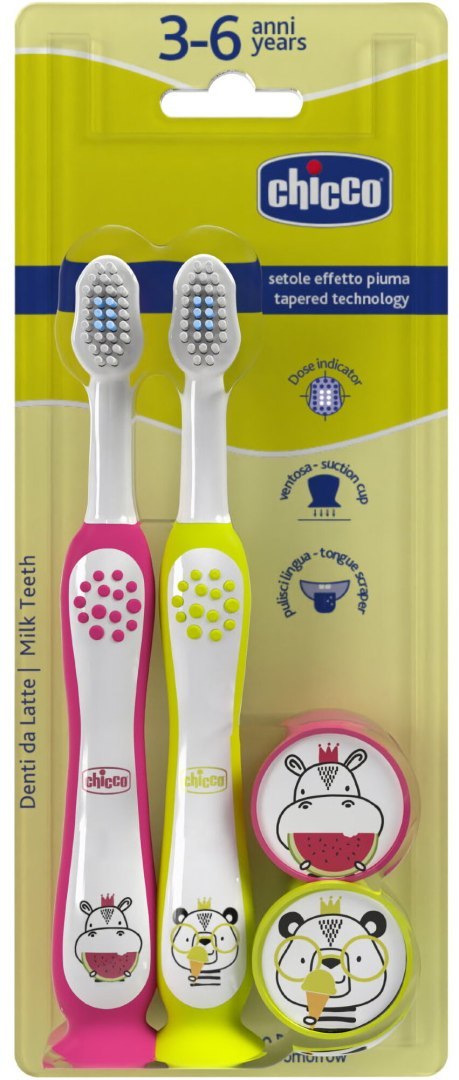 Szczoteczka do zębów marki CHICCO 2 sztuki Hippo i Panda przeznaczona dla dzieci w wieku od 3 do 6 lat. Nasza szczoteczka to nie tylko produkt, towarzyszący w codziennej rutynie higieny jamy ustnej, to także gwarancja ochrony delikatnej tkanki dziąseł oraz szkliwa zębów Twojego dziecka. Dzięki innowacyjnej technologii i najwyższej jakości materiałom szczoteczka do zębów Chicco zapewnia kompleksową pielęgnację już od pierwszych lat życia. Główka szczoteczki została specjalnie zaprojektowana z myślą o najmłodszych - wyposażona w skrobaczkę do języka, zapewniając kompleksową pielęgnację jamy ustnej Twojego dziecka. Dodatkowo ergonomiczny i antypoślizgowy uchwyt sprawia, że korzystanie z naszej szczoteczki jest łatwe i bezpieczne, nawet dla małych rączek. Pamiętaj, że codzienna higiena jamy ustnej to kluczowy nawyk, który warto wprowadzić już od najwcześniejszych lat. Daj swojemu dziecku najlepszy start w dbaniu o zdrowie jamy ustnej dzięki szczoteczce do zębów Chicco.