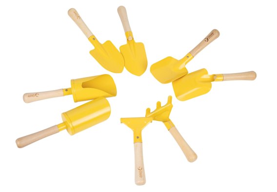 - - Narzędzia wykonane z wytrzymałego metalu w intensywnym żółtym kolorze oraz drewnianych uchwytów