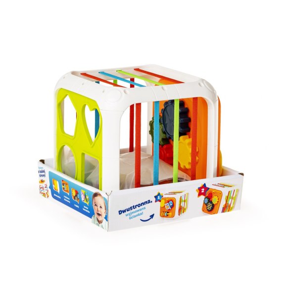 Ta kolorowa kostka to zaproszenie do wesołej zabawy! Zdobią ją sznureczki i sorter kształtów, a jedna z jej ścianek jest odpinana, co zapewnia wygodny dostęp do klocków. Poza tym, że ścianka ta jest odpinana, jest ona również dwustronna. Z jednej strony znajdują się trybiki do kręcenia, a z drugiej, ruchome elementy do przesuwania. Możliwość odpięcia ścianki pozwala zabrać ją ze sobą na wycieczkę, bez konieczności przewożenia całej kostki.