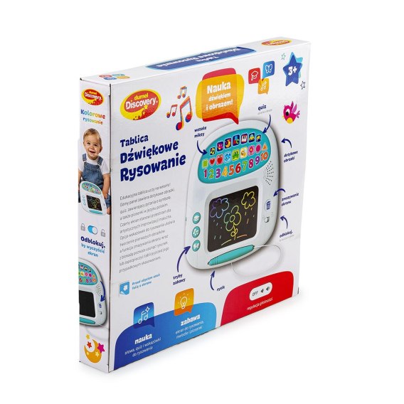 Ta edukacyjna tablica bawi, edukuje, a nawet inspiruje artystycznie! Zabawkę tworzy panel dźwiękowy, wyposażony w kolorowe przyciski z obrazkami, oraz tablica do rysowania. Kolorowe obrazki uczą liczenia, kolorów, kształtów, a także bawią grą w zgadywanie. Znajdziemy tu także wesołe melodie i zabawne dźwięki. Obok tablicy, stanowiącej przestrzeń do artystycznych improwizacji dziecka, znajdują się trzy dodatkowe przyciski, które aktywują wskazówki do rysowania oraz piosenki w języku polskim. Tablica wyposażona została w niezwykle przydatną funkcję blokady zmazywania, co pozwala zapobiec przypadkowemu usunięciu obrazka, narysowanego za pomocą dołączonego rysika.