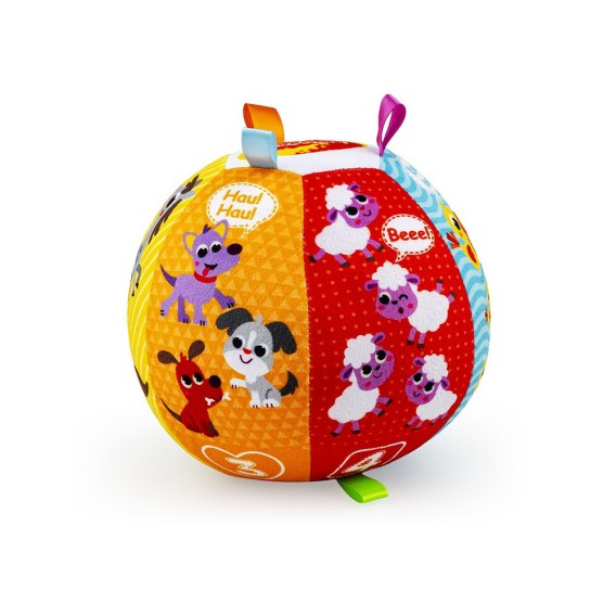 Milusia zabawka posiada materiałowe metki i mnóstwo obrazków przedstawiających zwierzątka, cyferki i kształty. Aby aktywować melodie, wystarczy podrzucić piłeczkę, a z jej wnętrza popłyną miłe dla ucha dźwięki. Zapięcie na rzep zapewnia wygodny dostęp do mechanizmu, w celu wymiany baterii lub wyjęcia mechanizmu do wyprania zabawki.