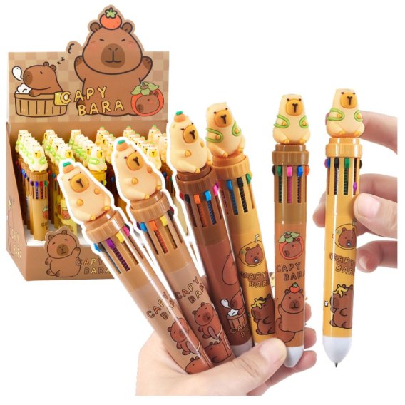 Ten uroczy wielokolorowy długopis z motywem kapibary to doskonały dodatek do każdego piórnika. Jego unikalny design łączy funkcjonalność z estetyką - ozdobna gumowa figurka kapibary na szczycie długopisu przyciąga wzrok.