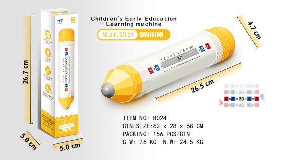 Edukacyjny długopis do nauki mnożenia i dzielenia dla dzieci od trzeciego roku życia. Długopis jest łatwy w użyciu, wystarczy tylko przekręcić dwa uchwyty znajdujące się na jego końcach, by uzyskać wynik mnożenia lub dzielenia. Zabawka uczy przez zabawę.