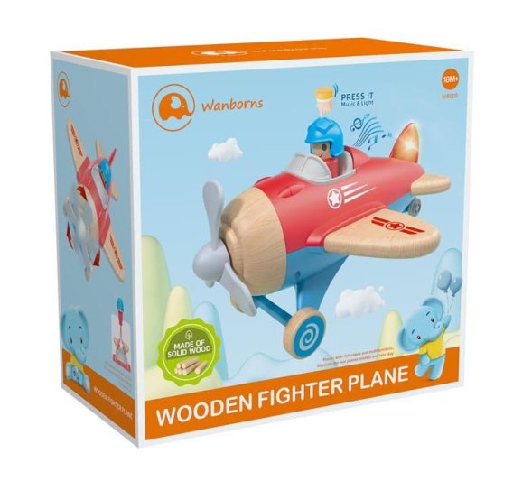 Interaktywny samolot z funkcją dźwięku i światła dla dzieci od osiemnastego miesiąca życia. Samolocik wykonano z najlepszej jakości materiałów: drewna i plastiku. Bogactwo kolorów przyciąga wzrok dziecka i zachęca do zabawy. Samolocik posiada podświetlenie tylnego skrzydła oraz funkcję dźwięków, odtwarza melodię i odgłosy startu samolotu, po naciśnięciu na figurkę lotnika. Zabawka zasilana jest bateriami typu 3 X AG13 (baterie znajdują się w zestawie). Funkcje: - zabawka dla dzieci od osiemnastego miesiąca życia, - wykonana z najlepszej jakości materiałów: drewna i plastiku, - bezpieczna, nie posiada ostrych zakończeń, - efekty dźwiękowe: melodie, odgłosy startu samolotu, - efekty świetlne: podświetlane skrzydło z tyłu samolotu, - ruchome kółeczka, - ruchome przednie śmigła samolotu. |