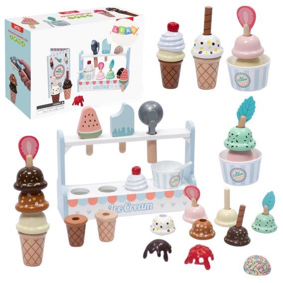 Drewniany Stragan z Lodami dla dzieci od 3 lat to kreatywna zabawa w odgrywanie ról. Zestaw zawiera stojak, 4 lody na patyku, 3 wafelki, 6 gałek, łyżkę i menu. Rozwija wyobraźnię, umiejętności społeczne i manualne. Wykonany z bezpiecznego drewna.