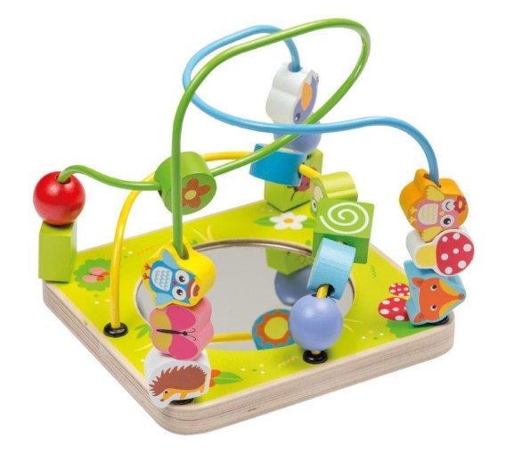 Ten wesoły drewniany labirynt - przeplatanka rozwija koordynację ruchową i logiczne myślenie dziecka. Ruch kolorowych kulek, kostek i elementów ze zwierzątkami, kwiatkami przeplatanych w sieci jest dobrym ćwiczeniem motorycznym dla dziecka i promuje koordynację ręka-oko. Dodatkowo cały labirynt umieszczony jest na podstawce z lusterkiem, co jeszcze bardziej zachęca do zabawy.