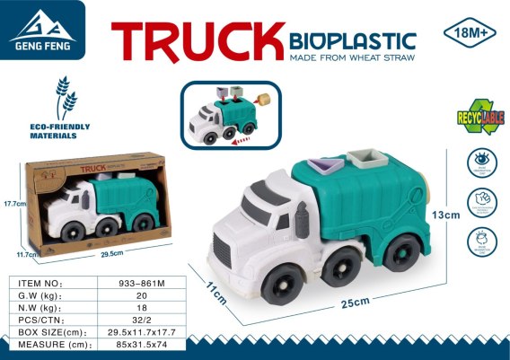 Pojazd śmieciarka z sorterem i klocuszkami, wykonana z BIOplastiku dla dzieci od osiemnastego miesiąca życia, z serii ekologicznej, przyjaznej dla środowiska. Pojazd wykonany został z dbałością o szczegóły, w pięknych żywych kolorach i nie posiada ostrych krawędzi. Na dachu śmieciarki i tylnej klapie znajduje się sorter kształtów, klocuszki w zestawie.
