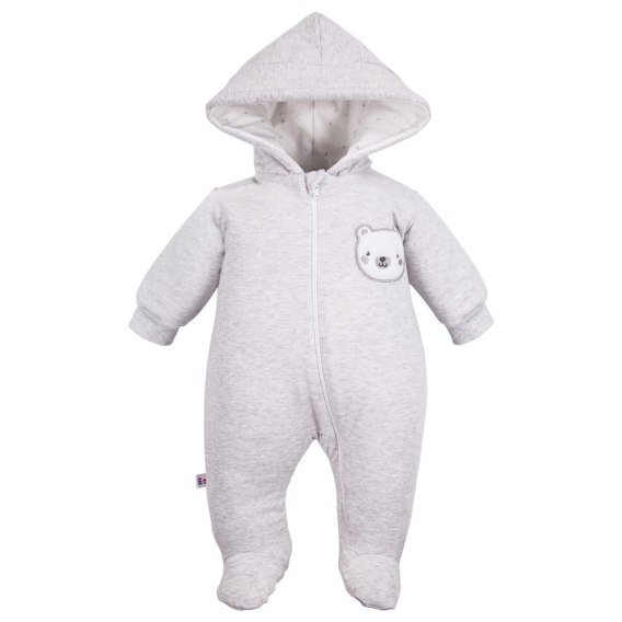 Kombinezon dziecięcy szary wykonany z bawełny i wypełnienia antyalergicznego. Kombinezon dziecięcy posiada kaptur. Podszewka w kombinezonie wykonana jest w 100% z bawełny. Pajacyk z kapturem będzie idelany na wyjście ze szpitala w chłodne miesiące. W wyprawce dla dzieci rodzących się zimą i jesienią to obowiązkowy element.