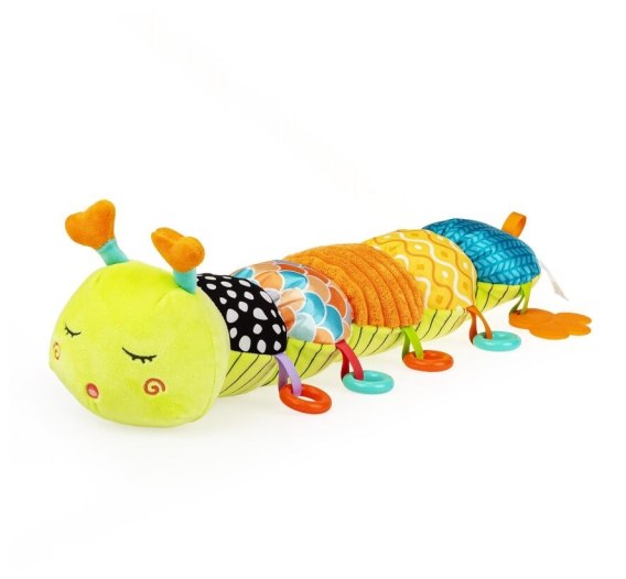 Kolorowa gąsieniczka grzechocze wesoło, zachęcając maluchy do wspólnej zabawy! Poszczególne segmenty jej ciałka uszyte zostały z materiałów o różnych fakturach, w tym takiego, który szeleści, a wszystko po to, aby stymulować zmysły dziecka, wpływając korzystnie na rozwój jego zdolności poznawczych. Zabawka wyposażona została w gryzaczek, kolorowe kółeczka oraz grzechotkę, ukrytą w ostatnim segmencie. Na brzuszku gąsienicy znajduje się miarka w centymetrach i calach, którą można wykorzysać do wesołych zdjęć dziecka z zabawką, a gdy maluch podrośnie - do nauki liczenia.