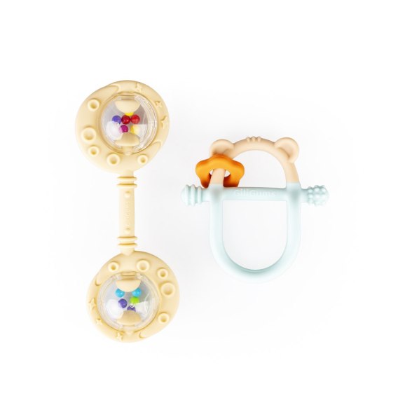 Dwupak łączy w sobie walory praktyczne i estetyczne, bawiąc oraz przynosząc ulgę w ząbkowaniu! W zestawie znajdziemy gryzak Miś oraz Podwójną Grzechotkę w kolorze beżowym. Obie zabawki posiadają wypustki, które podczas gryzienia będą delikatnie masować dziąsła ząbkującego bobasa. Kształt gryzaczka oraz grzechotki dopasowany jest do małych rączek, co umili maluchowi korzystanie z nich. Ten praktyczny zestaw świetnie sprawdzi się w charakterze prezentu.