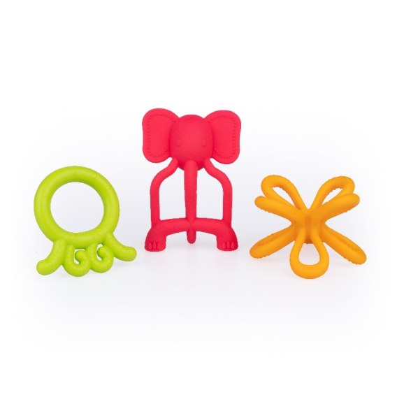 - w zestawie 3 gryzaki: czerwony słoń, zielona ośmiornica, pomarańczowy kwiatek
