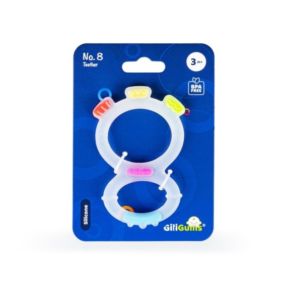Dwa brzuszki ozdobione wypustkami przyniosą ulgę w ząbkowaniu! Ten zabawny gryzaczek wykonany został z silikonu, dzięki czemu bez trudu go wyczyścisz, aby zapewnić maluszkowi higienę, podczas korzystania z zabawki. Kształt Ósemki dopasowany jest do małych rączek, co ułatwi maluchowi chwytanie gryzaka.