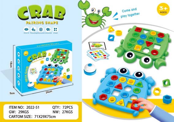 Zręcznościowa gra z krabem, dopasuj kolory, dopasuj kształty, ćwicz refleks dla dzieci od trzeciego roku życia. Gra składa się z dwóch plansz o kształcie kraba, kart z zadaniami i wyzwaniami, kart karnych, pionków o różnych kształtach i kolorach oraz dzwoneczka. W grę można grać samodzielnie lub w dwie osoby. Grając samodzielnie, losujemy kartę, kładziemy ją we wgłębieniu znajdującym się na górze planszy. Następnie próbujemy ułożyć pionki na planszy, w taki sposób jak to pokazuje karta. Dziecko uczy się rozpoznawać kształty i kolory. Jeżeli gramy w dwie osoby to wygrywa ta, która jako pierwsza skończy układać wzór z karty i naciśnie na dzwoneczek. Jeżeli wzór został ułożony poprawnie, gracz zabiera kartę, jeżeli zaś źle, wówczas gracz losuje kartę z pytaniami, a jeśli źle odpowie na pytanie wówczas musi podjąć wyzwanie. Jeżeli nie podejmie wyzwania, wówczas czeka na niego karta karna. Gra uczy przez zabawę spostrzegawczości, kształtów, kolorów, szybkości podejmowania decyzji.