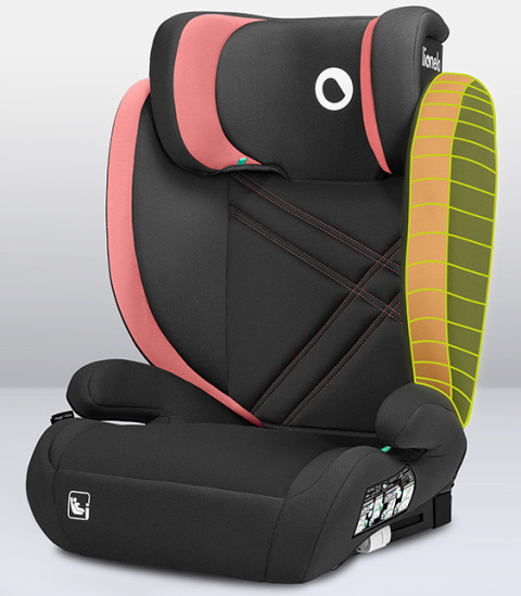 - Dodatkowa ochrona boczna wzmocniona po bokach absorbuje siłę uderzenia. Poduszka znajdująca się na zagłówku podpiera kark i zabezpiecza główkę dziecka.