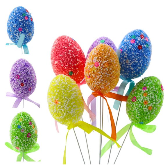 - Każde jajko ozdobione styropianowymi kuleczkami i wzorkami