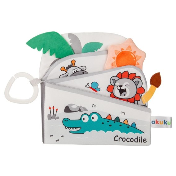 - kolorowe ilustracje - radosne postacie zwierząt (hipopotam, lew, krokodyl, motyl i inne) oraz żywe kolory przyciągają uwagę dziecka i stymulują rozwój wzroku,