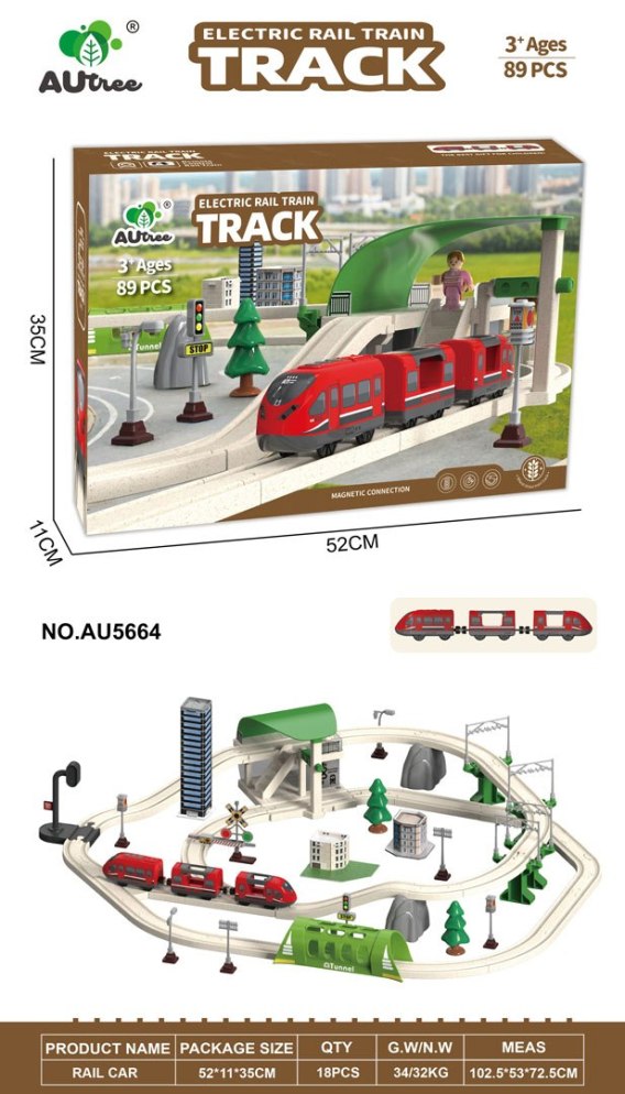 Interaktywna kolejka dla dzieci od trzeciego roku życia. Zestaw wykonano z bezpiecznych i trwałych materiałów, co gwarantuje mu niezawodność i długi okres użytkowania. W zestawie znajdują się tory, po którym porusza się pociąg, budynek stacji, tunel, jest też sygnalizacja świetlna. Na wyposażeniu mamy również budynki miejskie, znaki drogowe oraz figurkę. Ten zestaw daje wiele możliwości kreatywnej zabawy. Tunel zasilany jest bateriami typu 3 x AG13 (w zestawie), przejeżdżający przez niego pociąg uruchamia odgłosy jazdy pociągu i kolorowe mrugające światełka. Stacja kolejowa zasilana jest bateriami typu 3 x AG3 (w zestawie), posiada podświetlenie i wydaje odgłosy jazdy pociągu. Sygnalizacja świetlna zasilana jest bateriami typu 3 x AG3 (w zestawie), posiada efekty świetlne w postaci zmieniających się światełek. Pociąg zasilany jest bateriami typu 2 x AAA 1,5V (brak w zestawie), jeździ do przodu i do tyłu oraz wydaje odgłosy jazdy i ma podświetlane przednie reflektory.