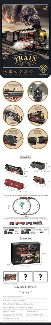 Zestaw retro kolejka z funkcją dymu, światła i dźwięku dla dzieci od trzeciego roku życia. Zabawka zasilana jest akumulatorem typu 3,7 V 1200 mAh (w zestawie). Podczas jazdy lokomotywa wypuszcza kominem i po swoich bokach dym, po wcześniejszym uzupełnieniu jej wodą (pipetka do wody dołączona do zestawu), świeci się przedni reflektor i słyszymy odgłosy jazdy. Tory są wytrzymałe i bezpieczne oraz posiadają łatwy sposób łączenia.