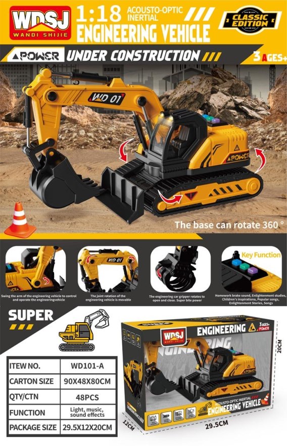Interaktywna koparka z funkcją dźwięku i światła oraz ruchomymi elementami dla dzieci od trzeciego roku życia. Koparka wykonana została w skali 1:18 z najlepszej jakości materiałów i z dbałością o szczegóły. Zabawka posiada ruchome elementy takie jak łyżka czy podstawa. Na dachu maszyny budowlanej znajduje się panel z przyciskami, które uruchamiają efekty dźwiękowe i świetlne. Zabawka zasilana jest bateriami typu 3 x AG13 (w zestawie). Funkcje: - zabawka dla dzieci od trzeciego roku życia, - wykonana w skali 1:18, - ruchome elementy: łyżka, kabina o 360 stopni, - efekty dźwiękowe: odgłos startu pojazdu, odgłos pracy koparki, odgłos cofania, - efekty świetlne: mrugające światełka na górze maszyny. |