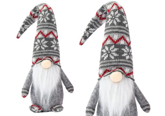 Szary krasnal świąteczny z szaro-czerwoną czapką, którą można dowolnie formować dzięki drucikowi. Stabilnie stoi dzięki zrównoważonemu obciążeniu. Wykonany z miękkiego, przyjemnego w dotyku materiału. Wymiary 40cm x 16cm.