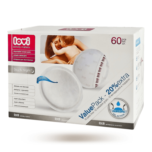 Super chłonne wkładki laktacyjne Lovi zapewnią Ci poczucie suchości i komfortu przez cały aktywny dzień, oraz w czasie snu, dzięki specjalnym warstwom oraz wkładom żelującym. Samoprzylepny pasek zapobiegnie przesuwaniu się wkładki, a odpowiednia szerokość zapewni ochronę ubrania przed zabrudzeniem.