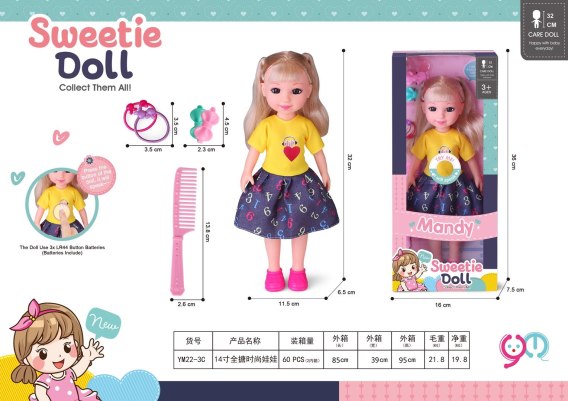 Śliczna laleczka Mandy z akcesoriami dla dzieci od trzeciego roku życia. Laleczka wykonana została z dbałością o szczegóły. Ma długie jasne włosy, ubrana jest w koszulkę, spódniczkę i buty. Na brzuszku lalki znajduje się przycisk uruchamiający efekty dźwiękowe takie jak wesołe melodie i pytania zadawane przez lalkę. Wraz z lalką w zestawie znajduje się grzebień, 2 spinki do włosów i 2 gumki. Lalka zasilana jest bateriami typu 3 x AG13 (w zestawie).