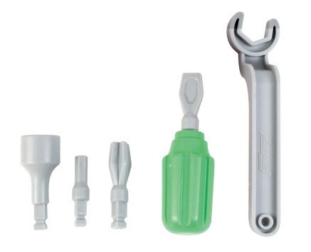 •  - W zestawie ręcznych narzędzi do ścianki Naukowo-Kreatywnej Masterkidz, znajduje się śrubokręt z 4 wymiennymi końcówkami, oraz klucz.