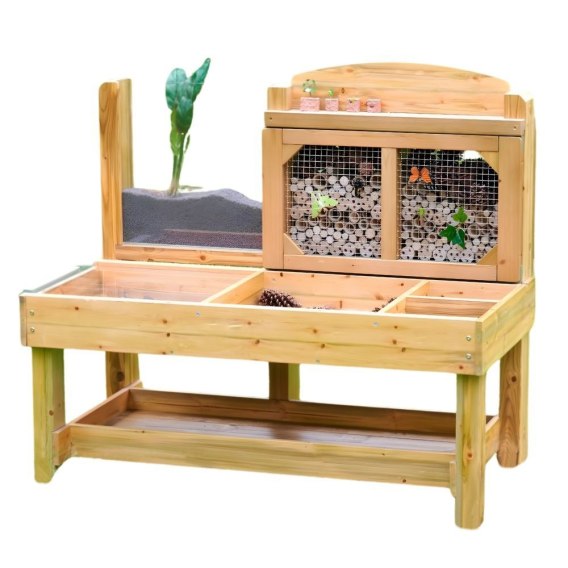 Praktyczny stół do obserwacji przyrody marki Masterkidz! specjalnie zaprojektowany do studiowania świata żywych stworzeń i przyciągania dzikiej przyrody do waszego ogrodu! Powierzchnia stołu jest podzielona na różne strefy do zbierania skarbów natury - małe sekcje na kawałki kory czy wiórki drewna, większe na kawałki drewna z lasu, liście i podobne cuda. Stacja obserwacyjna wyposażona w przezroczyste, zdejmowane miseczki ułatwiające zbieranie próbek, dużą komorę z przezroczystą pokrywą do obserwacji żywych okazów, takich jak ślimak sunący po akrylowej powierzchni. Tylny panel z drewnianymi rurkami zakryty stalową siatką, przyciąga owady oraz przechowuje. Dodatkowy akrylowy zbiornik, w którym można śledzić rozwój korzeni, plonów lub ruch robaków w ich naturalnym środowisku - to fascynujące doświadczenie dla małych odkrywców!