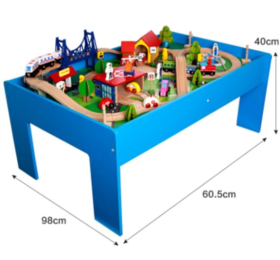 Drewniana kolejka ze stolikiem i mnóstwem akcesoriów, dla dzieci od trzeciego roku życia. W skład zestawu wchodzą drewniane tory z pociągiem i kolejką, umieszczone na drewnianym, stabilnym stole z rysunkiem drogi na blacie. Ponadto stolik posiada wystające ponad poziom blatu krawędzie, co zapobiega spadaniu elementów zestawu.