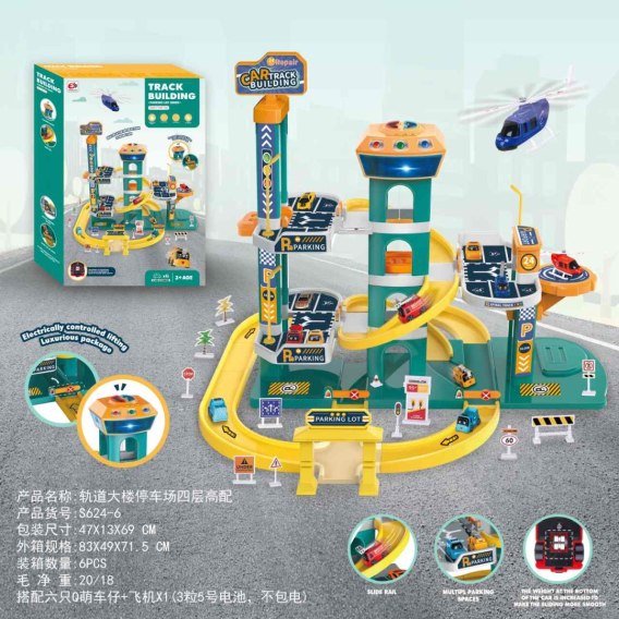 Znakomicie wykonany parking z efektem dźwięku i światła dla dzieci od trzeciego roku życia. Zestaw wykonany został z najlepszej jakości materiałów bezpiecznych dla dzieci w żywych kolorach. Parking posiada 2 poziomy, na których mieszczą się miejsca postojowe. Dostać do nich możemy się za pomocą elektrycznej windy zasilanej bateriami typu 3 x AA 1,5V (brak w zestawie). Na górze windy znajduje się panel odpowiedzialny za zjazd i wyjazd oraz efekty dźwiękowe w postaci wesołych melodii, odgłosów pojazdów, syreny i efekty świetne takie jak mrugające przyciski wjazdu i zjazdu. Autka zjeżdżać z góry mogą windą lub zjeżdżalniami. W zestawie znajdują się sześć autek i helikopter. Mamy też liczne latarnie, znaki drogowe i szlabany.