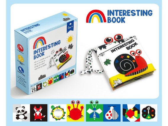 Sensoryczna książeczka dla maluszków od pierwszych dni życia. Książeczka wykonana została z bezpiecznych dla niemowlaczków materiałów. Na górze książeczki są wszyte 2 tasiemki i oczy raka. Pierwsza i ostatnia kartka jest szeleszcząca, w środku znajdziemy również lusterko i piszczałkę. Książeczka pomoże rozwinąć umiejętności skupienia, koordynację oko-ręka, będzie wsparciem w nauce kolorów, kształtów.