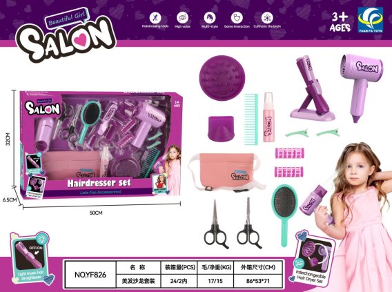 Bogato wyposażony zestaw małej fryzjerki dla dzieci od trzeciego roku życia. Zestaw wykonano z najlepszej jakości tworzywa sztucznego, z dbałością o szczegóły. W skład zestawu wchodzi suszarka z wymiennymi końcówkami, prostownica do włosów, 2 spinki, grzebyk, dwa rodzaje nożyczek, szczotka, buteleczka na kosmetyk do włosów oraz 2 wałki do włosów. Wszystkie elementy zestawu można zmieścić w torebce fryzjerskiej z paskiem, wykonanej z różowej ekoskóry. Prostownica zasilana jest bateriami typu 2 x AG13 (w zestawie), suszarka bateriami typu 2 x AAA 1,5 V (brak w zestawie). Prostownica posiada podświetlenie, a suszarka wydaje odgłosy suszenia i posiada lekki nawiew.