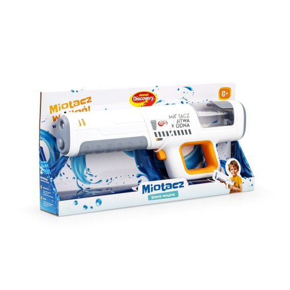 Misja: bitwa wodna! Ten imponujący miotacz wody wyposażony został w zbiorniczek, mieszczący pół litra wody, która to ilość wystarczy na oddanie około stu wodnych strzałów! Miotacz posiada dwie opcje napełniania wodą, poprzez ręczne nalanie wody we właściwy otwór, a także poprzez automatyczne zassanie wody lufą miotacza (tę funkcję uruchamia specjalny przycisk z prawej strony zabawki). Wyrzutnia posiada imponujący zasięg działania, gdyż tryska ona wodą na odległość aż do 10 metrów!