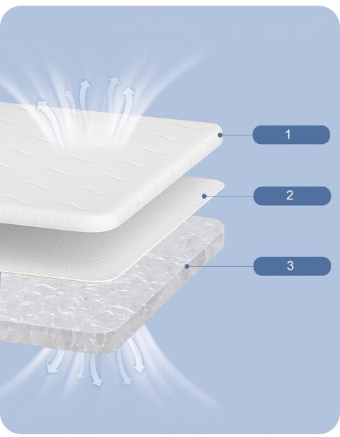 Ten materac w rozmiarze 120x60 cm doskonale dopasowuje się do standardowych łóżeczek dziecięcych. Dzięki swojej oddychającej strukturze 4D, gwarantuje prawidłową wentylację materaca oraz zapobiega nadmiernemu poceniu się dziecka.