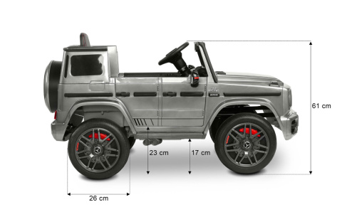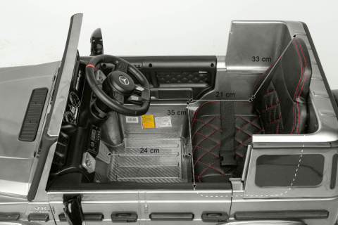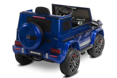 Mercedes AMG G 63 to pojazd na akumulator wzorowany na kultowym i niezniszczalnym Mercedesie klasy G. Przyszłych kierowców oczarują wyrazisty wygląd, błyszczący lakier i podłoga z fakturą imitującą włókno węglowe, wygodne siedzenie, kierownica z przyciskami oraz składane lusterka. Jak przystało na samochód tej klasy, akumulatorowiec zapewnia wysoki komfort jazdy dzięki tylnym amortyzatorom i kołom z pianki EVA. Mercedes wyposażony jest światła led oraz panel multimedialny do którego można podłączyć pendrive z ulubionymi piosenkami w formacie MP3. Rodzicom spodoba się wolny, zdalne sterowanie oraz wysuwana rączka ułatwiająca przenoszenie. Pojazd napędzają dwa mocne silniki 12V z akumulatorem o pojemności 7 Ah.