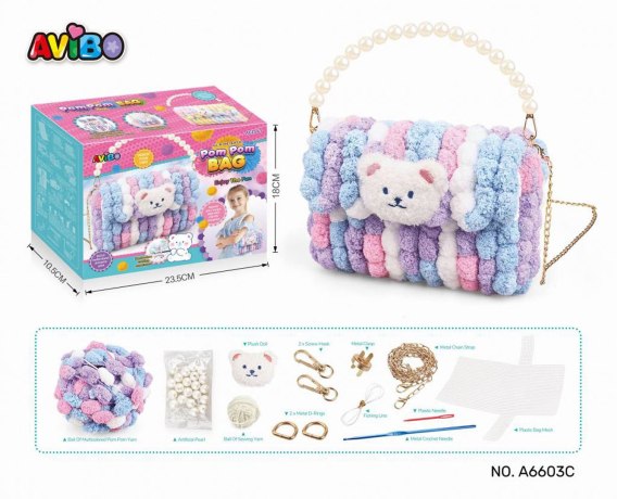 Zestaw do samodzielnego zrobienia torebki dla dzieci od szóstego roku życia. Zestaw wyposażono we wszystko, co niezbędne, aby wykonać swój własny projekt torebki. Mamy miękki sznureczek z pomponami, zapięcia, koraliki, łańcuszek, włóczkę, sznurek, plastikową formę do torebek, stanowiąca jej szkielet, igłę i szydełko. Każdy mały projektant stanie się specjalistą od robienia torebek.
