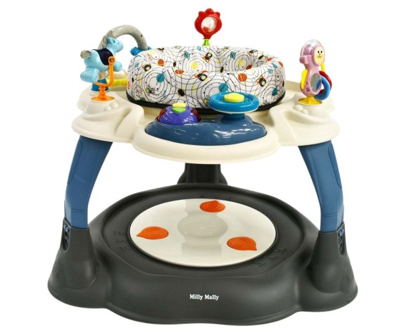 Siedzisko obraca się o 360°, co umożliwia maluchowi dostęp do wszystkich atrakcji znajdujących się na blacie. Ruchome elementy, różnorodne faktury i żywe kolory stymulują zmysły dziecka, rozwijając jego koordynację wzrokowo-ruchową oraz zdolności manualne. Wśród zabawek znajdują się m.in. grzechotki, obrotowe figurki i elementy dźwiękowe, które zachęcają do odkrywania i eksperymentowania.