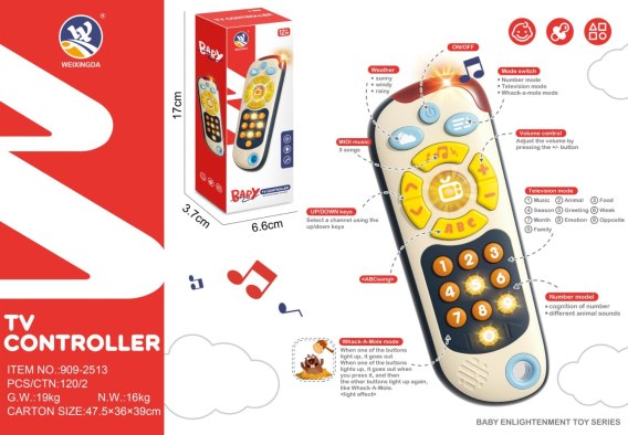 Interaktywny pilot dla maluszków od dwunastego miesiąca życia. Zabawka wykonana została z najlepszej jakości tworzywa sztucznego i nie posiada ostrych zakończeń. Bogactwo kolorów i funkcji przyciąga uwagę maluszka i zachęca do interaktywnej zabawy. Na górze pilot posiada podświetlenie, są też trzy niebieskie przyciski: włącznik/wyłącznik, przycisk z chmurką uczący rozróżniać pogodę (słonecznie, wietrznie, deszczowo) oraz przycisk z wyborem trybów: numery, kanały telewizyjne i gra ubij kreta. Niżej znajduje się żółte koło z przyciskami, a w centrum koła podświetlany przycisk z telewizorem. Przycisk z nutką i ABC uruchamia melodie, +/- to regulacja głośności a ^/v zmienia między trybami. Na dole znajduje się klawiatura numeryczna od 0 do 9. W trybie numerycznym po naciśnięciu na dany numer słyszymy jego nazwę w języku angielskim oraz odgłos zwierzątka. W trybie telewizyjnym po naciśnięciu na przycisk usłyszymy odgłosy: muzyka, odgłosy zwierzątek, powitanie, emocje, nazwy miesięcy, żywności, pór roku, tygodni. W trybie ubij kreta, podświetlają się przyciski, a maluch musi je zręcznie naciskać. Zabawka zasilana jest bateriami typu 2 x AAA 1,5V (brak w zestawie).