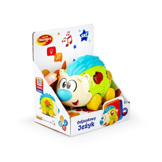 Słodziak na kółkach bawi dźwiękiem i światełkami! Jeżyk ze sznureczkiem do prowadzenia rączką, posiada na boku dwa aktywne przyciski, w kształcie grzybka i jabłuszka, które po naciśnięciu świecą, a także aktywują melodie oraz edukacyjne piosenki. Na drugim boku jeżyka znajduje się motylek, który podczas przesuwania zabawnie terkocze. Zwierzak wyposażony został w praktyczny przełącznik ON/OFF, umożliwiający wyłączenie jeżyka po zakończonej zabawie.
