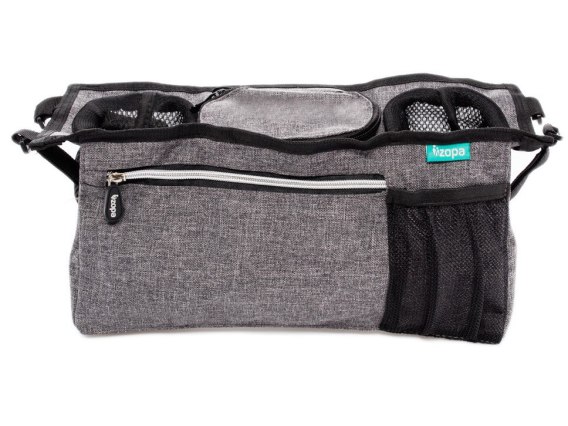 Praktyczny i usystematyzowany organizer do wózka idealnie nadaje się na spacery z dzieckiem. W przedniej części znajduje się zapinana na suwak duża kieszeń na drobiazgi, których może potrzebować każda mama podczas spaceru. Obok jest również kieszeń na telefon komórkowy wykonana z siatki, mama będzie zawsze wiedzieć, co się dzieje z telefonem nawet jeśli wyciszyła w aparacie dźwięk, żeby nie budzić dziecka. W części środkowej znajduje się duża, zamykana na suwak kieszeń, gdzie można przechowywać pozostałe niezbędne rzeczy. Po bokach znajdują się dwa uchwyty na napoje. Organizer można łatwo przymocować do wózka za pomocą czterech haczyków na rzep.