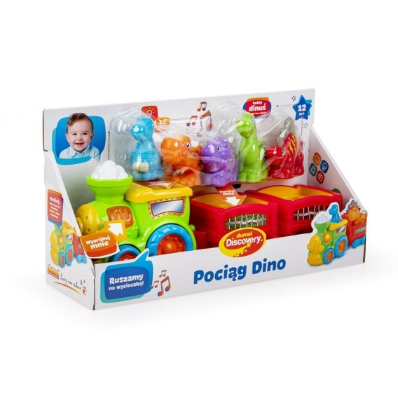 Rycząca piątka wesołych dinusiów jedzie na wycieczkę! Sprawdź jaki odgłos wydaje każdy z nich, umieszczając dinozaury w odpowiednich miejscach. Na boku lokomotywy znajduje się przycisk. Gdy go naciśniesz, zacznie świecić, z głośnika zabawki popłyną realistyczne dźwięki, a pociąg pojedzie do przodu. Naciśnij przycisk ponownie, aby usłyszeć wesołą melodię.