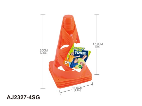 Zestaw czterech pachołków do treningu piłki nożnej dla dzieci od trzeciego roku życia. Pomarańczowa kolorystyka sprawia, że są bardzo dobrze widoczne na trawie. Lekkie, przenośne, mają otwory do zakotwiczenia w podłożu, by były odporne na wiatr. Można je używać nie tylko do treningu piłki nożnej, ale np. do odgrodzenia strefy zabaw, jazdy na rowerze czy oznaczenia toru wyścigowego dla autek na akumulator.
