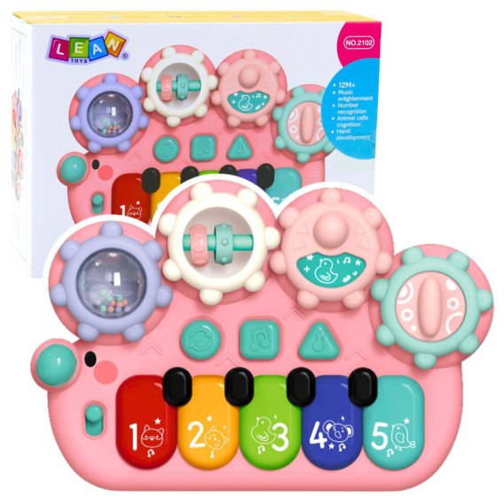 Na górnym panelu znajdują się koła zębate do kręcenia, które angażują paluszki dziecka i wspomagają rozwój motoryki małej. Kolorowe, oznaczone cyferkami klawisze wydają melodie i dźwięki, wprowadzając malucha w świat muzyki i rytmu. Całość została utrzymana w delikatnej, pastelowej różowej kolorystyce, która zachęca do zabawy i cieszy oko.